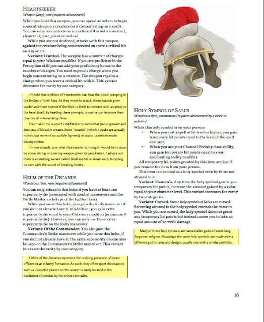 This is a really nice pdf. I like the layout. I LOVE the hyperlinked table of contents; it makes jumping around really easy. There are items of all shapes and sizes and of all power levels here. I think Joel did a really good job tying many of them to specific 5e mechanics and class features. This isn't a bunch of thrown-together ideas. Honestly, given the quality and the large amount of items here, I could probably get by with just this supplement and the officially published stuff and never need to look anywhere else.