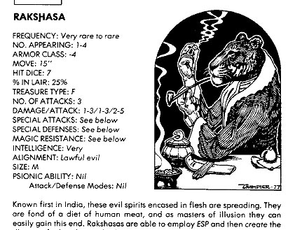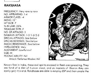 Now let's take a quick trip down memory lane. In 1e monster statistics, you have a couple of listings that I really wanted to include in my new block: Special Attacks, and Special Defenses. I decided to put a monster's primary attack routine under the listing "Attack". This listing also includes a creatures "basic attack", as its basic attack tends to be included in its primary attack routine. I also kept the "Traits" listing, used exactly the same way as it is in late 4e. Then, if needed, there are three other possible listings underneath "Attack". "Special Attacks" is used if a creature has any other attacks besides its primary attack routine and basic attacks; it also can include situational bonuses or tweaks to the primary attack routine. "Special Defenses" is used if a creature has a purely defensive power, i.e. one that does not include an attack. Finally, "Special Movement" is listed if a creature has a special power that is purely movement related.