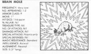 I've mentioned before what a complete bore I find determining monster ability scores, so when I say "Intelligence" I do not mean to suggest I will be giving an Intelligence score. Instead it is used somewhat like it was in 1e. If you look at the picture of our friend, the Brain Mole, you see that for Intelligence, a numerical value is not given, just a term; in this case, "Animal".