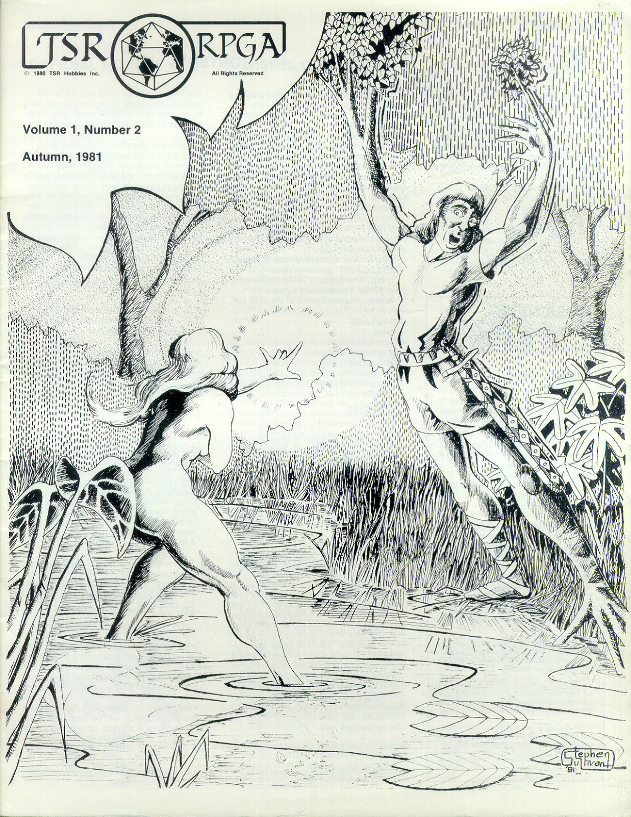 The Round Table recaps some tournament play from GenCon XIV. Dispel Confusion clarifies some rules. Dragon breath does damage equal to starting hp in AD&D, current hp in Basic. Saddlebag carrying capacity. Enlarge spell info. Bag of Tricks offers a few tips from readers, none of which are really worth noting. Crappy issue so far.