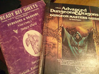 I also keep the Judges Guild Ready Ref Sheets (so buttery) and the 1e DMG at my table regardless of edition.
