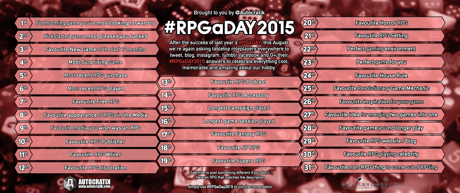 So there is this RPG-A-DAY thing going around, and while I would love to keep up with something like this for a month, it just isn't going to happen, so I thought I would post all of my answers in a single blog post.